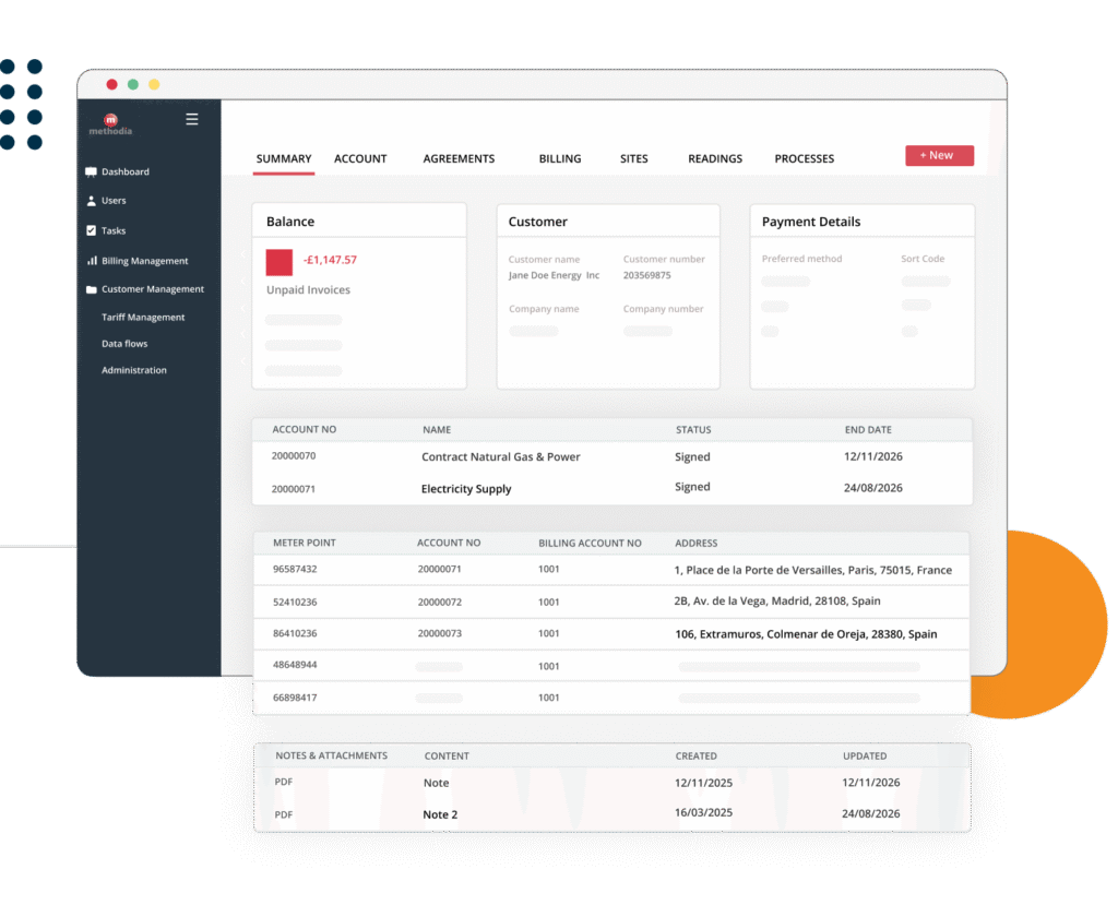 - Contract management, billing and meter data. Create and track contracts with versions and approvals, sync meter readings in real time, and get a full view into billing information.